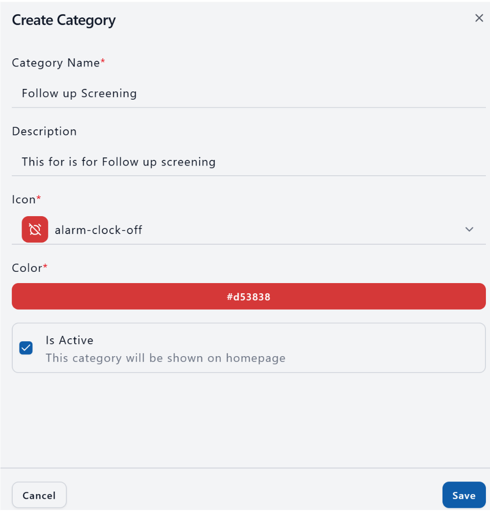 Fill in the inform required. Note that “Category Name” will be shown in the services available. Refer to the screenshot below